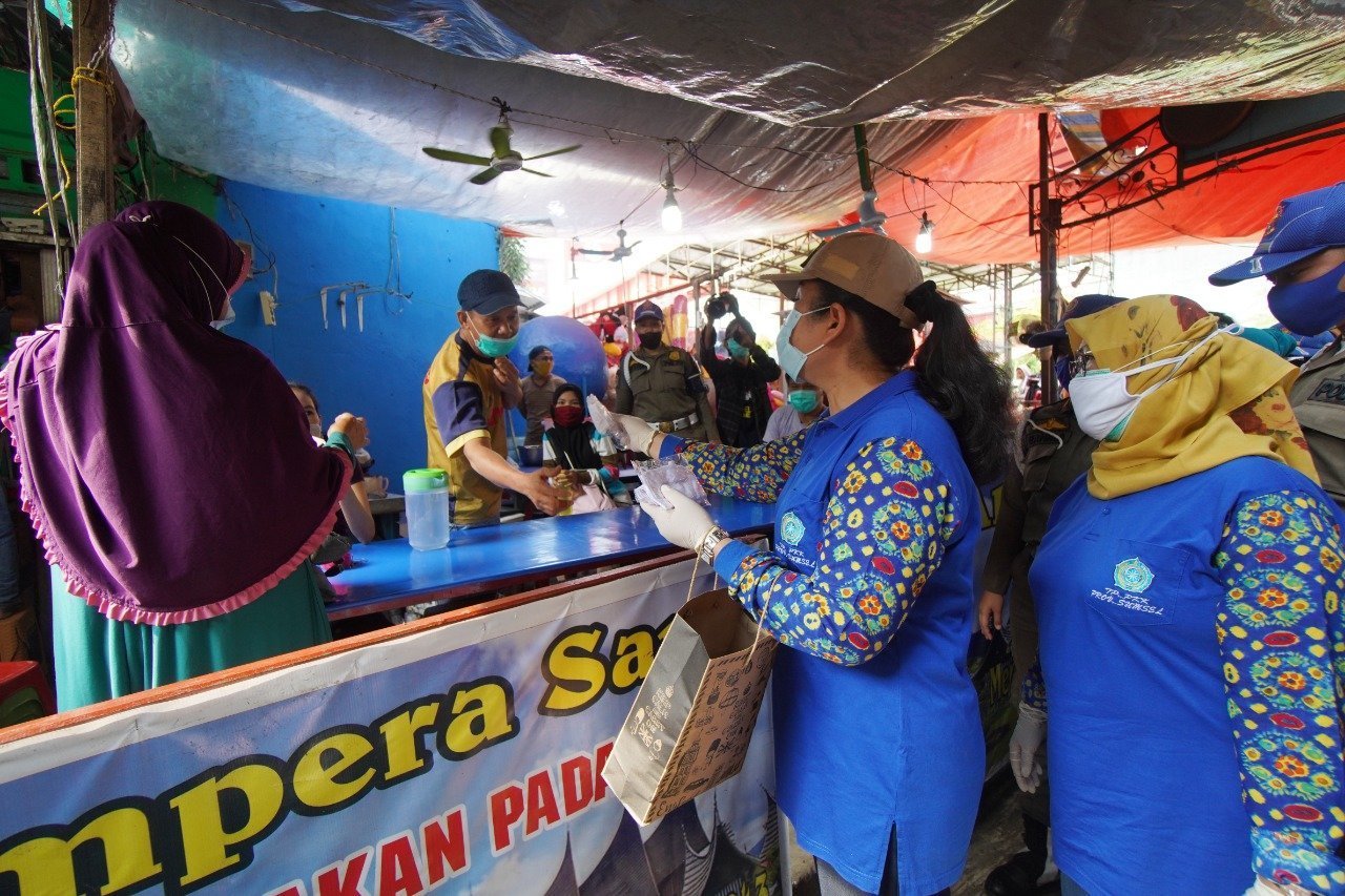 PALEMBANG – Ketua TP PKK Sumsel, Feby Deru bersama Wakil Ketua 1 TP PKK Sumsel Fauziah Mawardi Yahya terus melakukan sosialisasi penerapan protokol kesehatan Covid-19. Kali ini, keduanya berkeliling dari pasar ke pasar untuk sosialisasi dan membagikan masker gratis kepada pedagang dan pengunjung pasar, Selasa (11/8/2020).