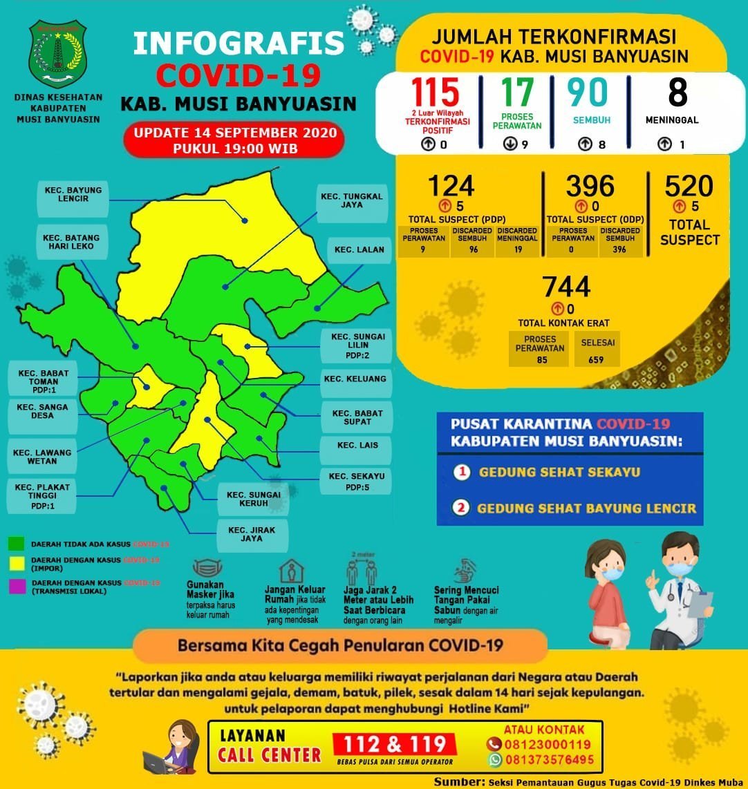 Sementara itu, berdasarkan data update Gugus Tugas Penanganan COVID-19 Muba 14 September 2020 tercatat ada sebanyak 396 ODP 0 selesai pemantauan masih dipantau 396 orang, 744 kontak erat 659 kontak selesai pemantauan 85 kontak erat yang masih dipantau, 124 PDP 9 proses pengawasan 96 selesai pengawasan (Endang S)
