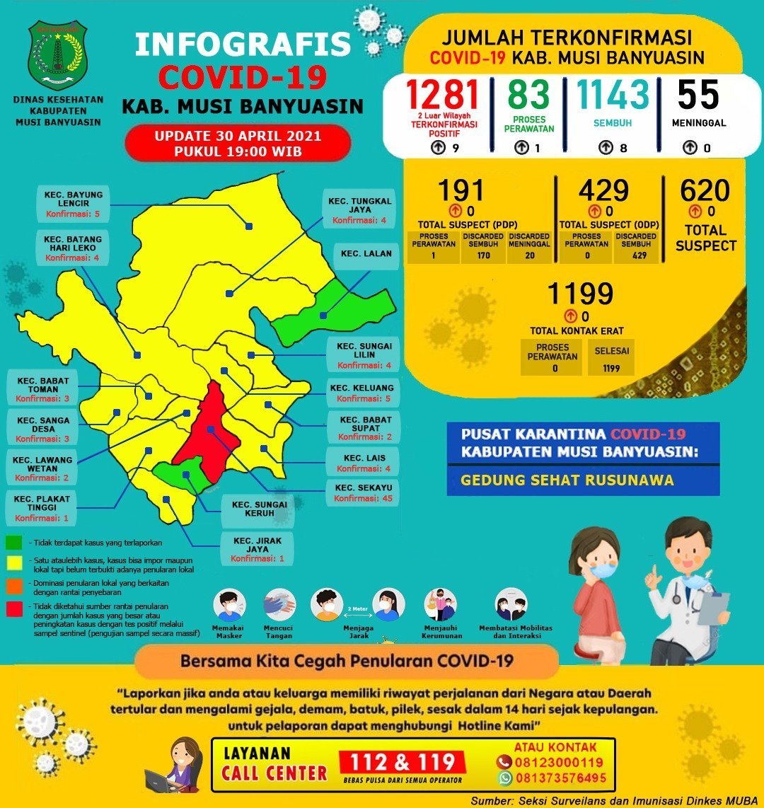 “Ada penambahan 8 kasus sembuh dan 9 terkonfirmasi positif per 30 April 2021,” ungkap Jubir Gugus Tugas Penanganan COVID-19 Muba, Seftiani Peratita SS MKes.