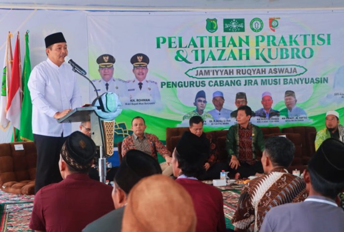 Sekayu, Muba – Wakil Bupati Mub Kyai Rohman menegaskan pentingnya menjadikan Al-Qur’an sebagai sumber obat dan pedoman hidup umat Islam. Hal ini diungkapkanya saat membuka Pelatihan Praktisi Ruqyah dan Izajah Kubro Jam’iyyah Ruqyah Aswaja (JRA) di Pendopoan Rumah Dinas Wabup, Kamis (4/9/2025).
