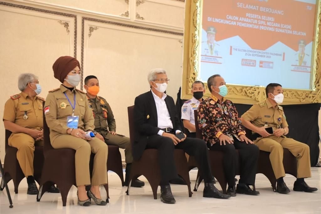 PALEMBANG – Wakil Gubernur Sumatera Selatan (Sumsel) H Mawardi Yahya meninjau langsung pelaksanaan seleksi Sistem Kompetensi Dasar (SKD) berbasis Computer Assisted Test (CAT) untuk Calon Pegawai Negeri Sipil (CPNS) dilingkungan Pemprov Sumsel di The Sultan Convention Centre Palembang, Selasa (21/9).