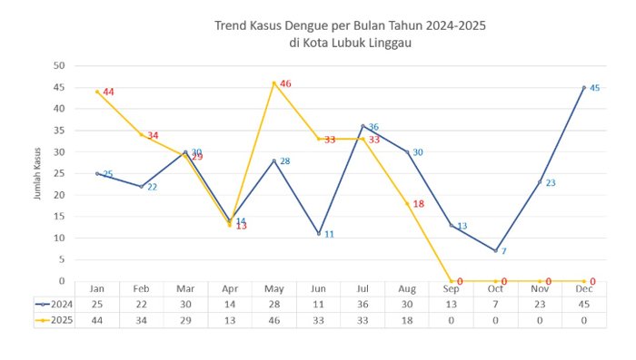 Berdasarkan data yang diberikan Dinas Kesehatan (Dinkes) Lubuk Linggau, kasus DBD per Agustus 2024 sebanyak 196 kasus, sementara itu di tahun per Agustus 2025, tercatat sebanyak 250 kasus atau naik 27,5 persen.