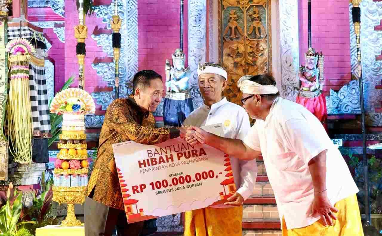 Tidak hanya hadir, orang nomor satu di kota Palembang itu juga sekaligus menyerahkan bantuan dana operasional untuk kebutuhan Pura kepada pengurus Perkumpulan Adat Bali Sumatera Selatan (PABSS).